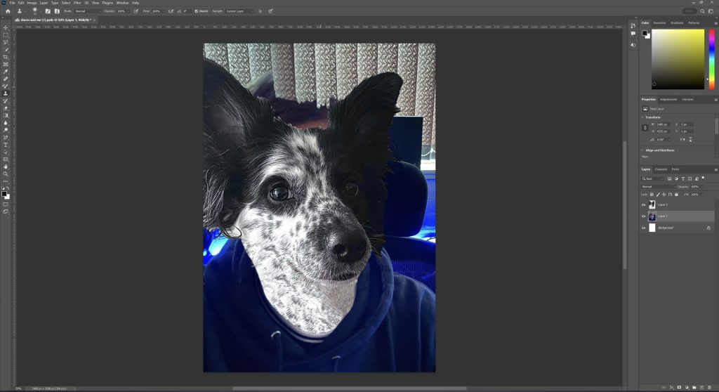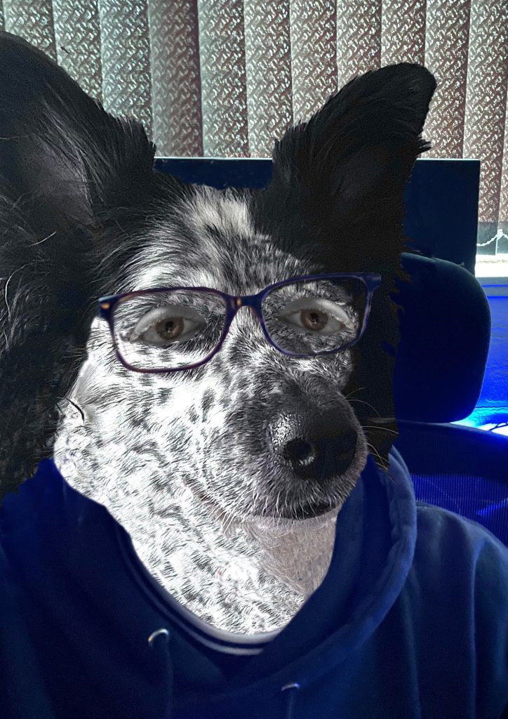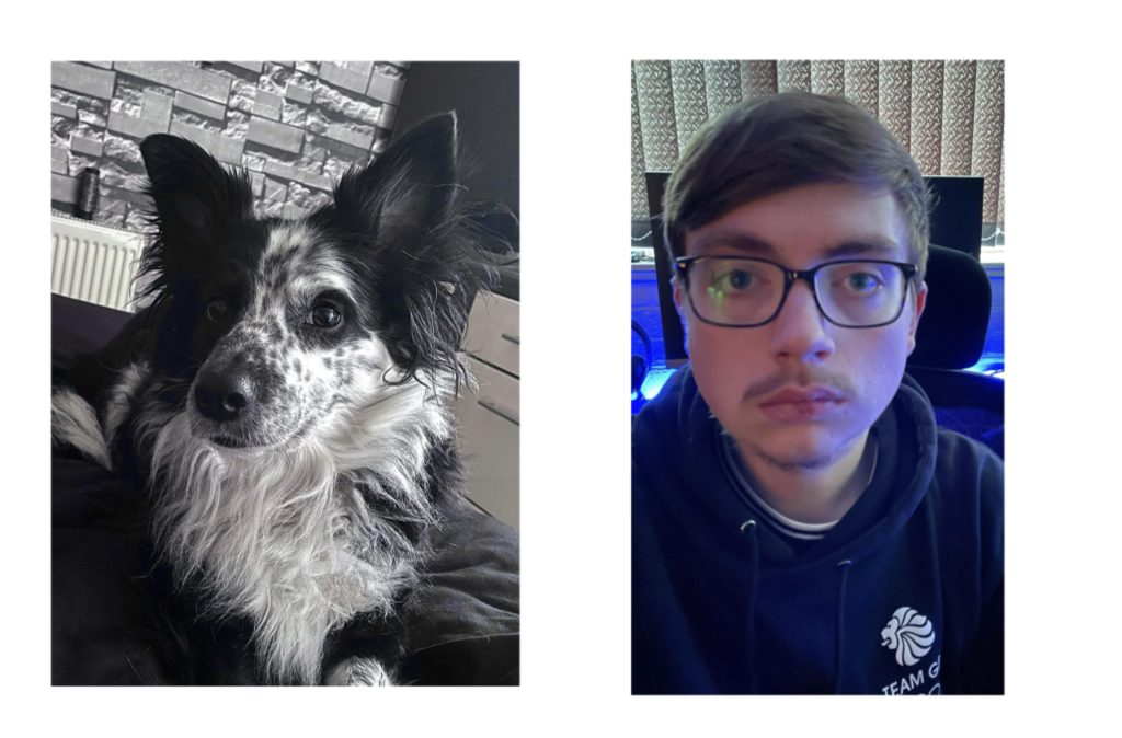 For this piece I took a completely different approach and creating something unique or something you don’t see created often. For this piece I created an image of myself and my dog Storm and combined them together. To create this piece I took a simple picture of myself and one of the better photos of my dog, then using the selection tool selected the head of my dog and copy and pasted it onto the top of my own. I then used the clone stamp tool and changed my neck to make it look as though it is my dogs to look as though she is actually wearing the hoodie and shirt and as though it is her taking the photo and so that the head of my dog didn’t look as though it had just been planted on the top of mine. I then used the clone stamp tool to remove my head from the background and make it look as though my blinds and monitor are seen in the background (image added below to further show what I’m trying to explain). To keep the portrait relevant to me I added some of my own features, so added in my eyes and glasses, I used the colour replacement tool to change my skin around my eyes grey to match the colour of my dog and again used the clone stamp tool to blend the around around my eyes and make it look apart of my dog. The reasoning behind this piece was to highlight a big part of my life, which is my dog storm as she is something that has helped me through a lot and helped me be the person I am today, many people have said how my dog is like my shadow and are always together so I created this piece to represent that and the bond between me and my dog.