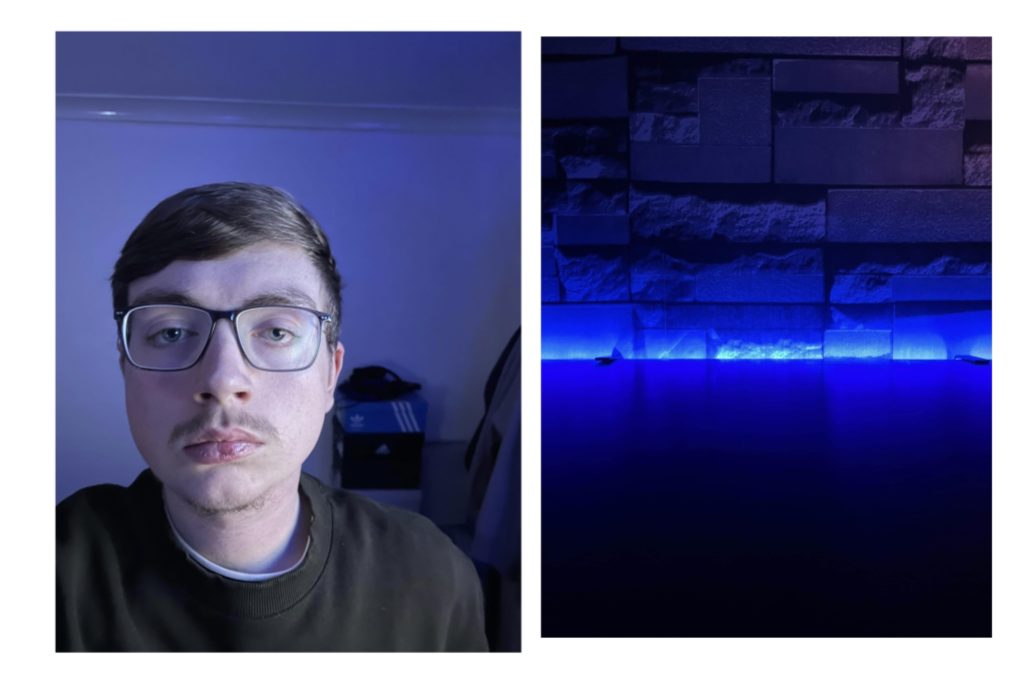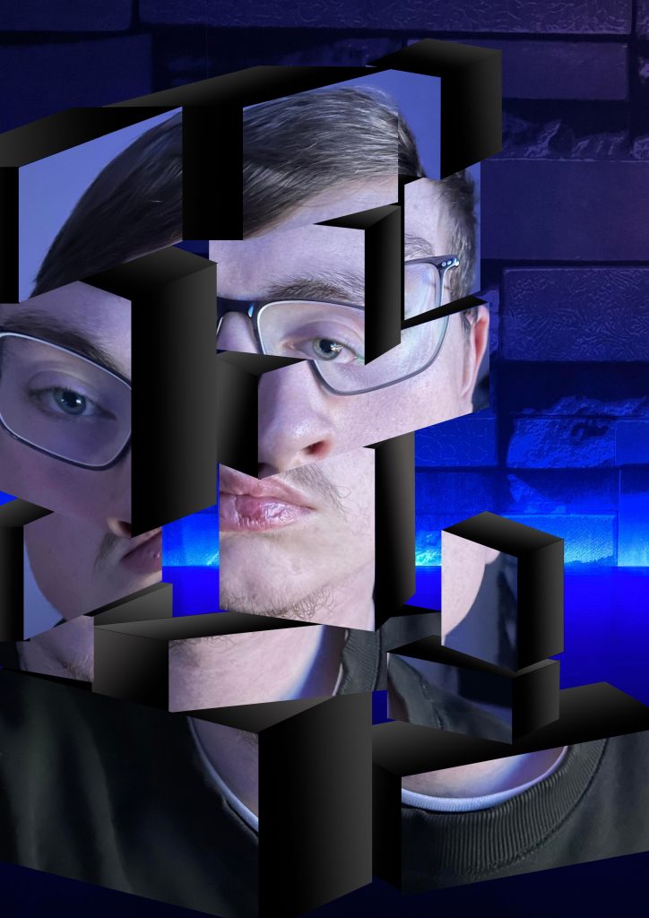 For my two photoshop portraits I wanted to take to completely different approaches. For this first piece I created the image in the form of building blocks. The reason for this is to reflect/ show how people view me and/ or who I am as a person, many people describe me as a “quiet” or “laid back” person, however, the people who I am more closer to may describe me as the complete opposite. The use of building blocks was to help signify that once someone has has all the pieces of me then they will start to get the full image, so this piece signifies the progression of getting to know me as a person and also me getting to know them and how I could be piecing them together trying to figure them out as a person, or in simpler terms could signify the puzzle of figuring me out as a person and what I’m really like once I’m outside my shell or given out all my pieces and my full form can be shown. I created the blocks by cutting out pieces of a photo of myself into different pieces and then transforming them in photoshop changing the perspective of each piece to make them look as though they are on different angles and then used the shape tool to add the edges and make cuboid shapes and changed the colour of them and added a gradient to add a sense of shadow and light on each piece. I placed each block in the position of where they would generally be in the original photo and not just randomly so that I am still identifiable in the image and used a photo of my desk in the background blank so it looks as though I have actually placed them onto it.