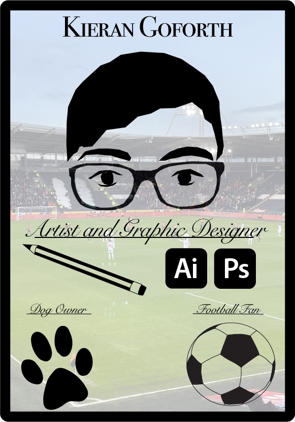 For my two self promoting images I wanted to take two completely separate approaches. For this first design I decided to go with a more simple and clean design in a way that tells a lot about me as a person and as an artist/ designer. The choice to use two different fonts was done to separate the two and highlight the part that is more important and the other slightly less, so the font used for my name is a serif font (as is the other font) but is a lot bolder than the other which highlights it that bit more, this is so my name can be highlighted to the viewer so that they know who it is they’re looking at. The other font been in a more “fancier” looking serif font is used as it looks more loose and wavy which links to the stroke of a pen/ pencil further highlighting what I am promoting of myself (art and graphic design). To add more decoration to the poster I drew out a few 2D logos and items to show my interests, strengths and some of the things I use, this was done using mostly the pen tool. The reason to add in extra information such as the “dog owner” and “football fan” was so the viewer knows a bit about me on a more personal level, so that if it was for example a customer/ client who was viewing this they would know that extra bit about me and could lead to a better bond/ relationship with them. I added a photo in the background of my local football team and one of their games as football is a big part of my life and is where I spend the majority of my weekends, watching football. This is also added to signify that something I look to be doing in the near future is to potentially use my skills in the sport industry someday. I added the rounded border around the piece to give it the look of a business card, something that I can hand out, however most business cards are usually in a horizontal format so I wanted to go against the norm and create a vertical one.