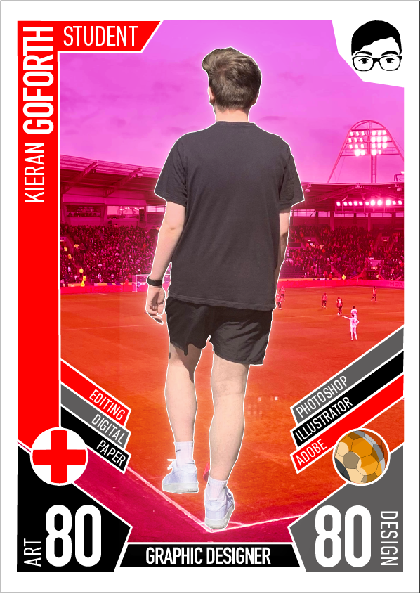 For this second poster I took a completely different approach and created a slightly more complex poster, this poster was made using a mixture of both photoshop and illustrator. This poster I created to look like a football card, or better known as “match attax” which is something I used to collect when I was younger. I designed it using the colours of the football team I support (Manchester United) and replaced many things within the card to promote me as an artist and graphic designer rather than a footballer. I started by replacing the stats with the things I use as a designer and artist and also added a few of my traits and also tried to keep it relevant to a “match attax” card by keeping a rating of both my artistic skills and my design skills (80/ 100). I designed the card so that it was compositionally symmetrical keeping it exactly the same on both sides of the card towards the bottom so that nothing looks as though it was placed randomly, and also helps separate the card into sections. I used a san serif bold font as typically that is the type of font used within something sport related and also looks sharp which is an aspect you would expect in a sportsman or sport as a whole. In the centre of the piece I added a photo of myself to further highlight that I am the person the poster is about with my name on the left and “student” to further highlight the stage I am currently in my life. The choice to create it in the format of a football card was again to promote in the future something I aim to be doing is to be using my design skills within the sporting industry. The background image is the same image used in the first poster, however I changed the hue of the image in photoshop to red to keep it relevant to my chosen colour scheme.
