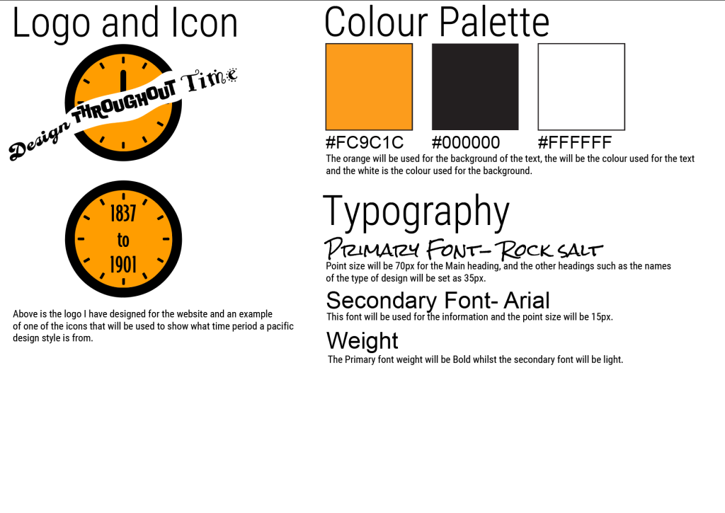 For my website I wanted to design a logo that was more simple but still conveyed the purpose of the website, so I created a simple 2D clock and placed the title that I chose of “Design throughout time” which I chose as it stays relevant to the purpose of the website, which is to show how design has changed throughout time. I designed the icons that I use to display the time periods in the same way to create a sense of familiarity and not make the website looking random with lots of different shapes and icons, to keep a clean and tidy look. The text within the logo I changed the fonts to show the different fonts that have been used in the different types of designs.