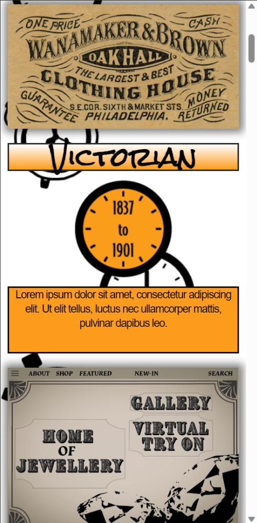 For the layout of the website when scrolling the found images of the specific design styles will always be on the left hand side and my modernised recreations will be on the right and will be separated by the icons i designed that will be placed between in the middle along with the headline stating the name of that specific style and also some text explaining the style and how i have created a modern day web style page in that said style. However, in the mobile companion the images will be placed stacked in one row due to the slimmer screen, the found image will be at the top and my recreation at the bottom with the icon, headline and text in between separating the two again, examples can be found below.