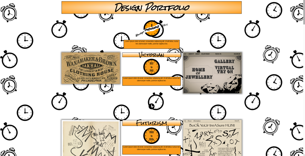 For the fonts of my website I decided to use both a serif and sans-serif font to again show how the typography has changed over the years and also how it differs from one style of design to another. I created a simple background using a couple of 2D clocks to create a bit of decoration within the site whilst also keeping relevant to the topic of the site.
