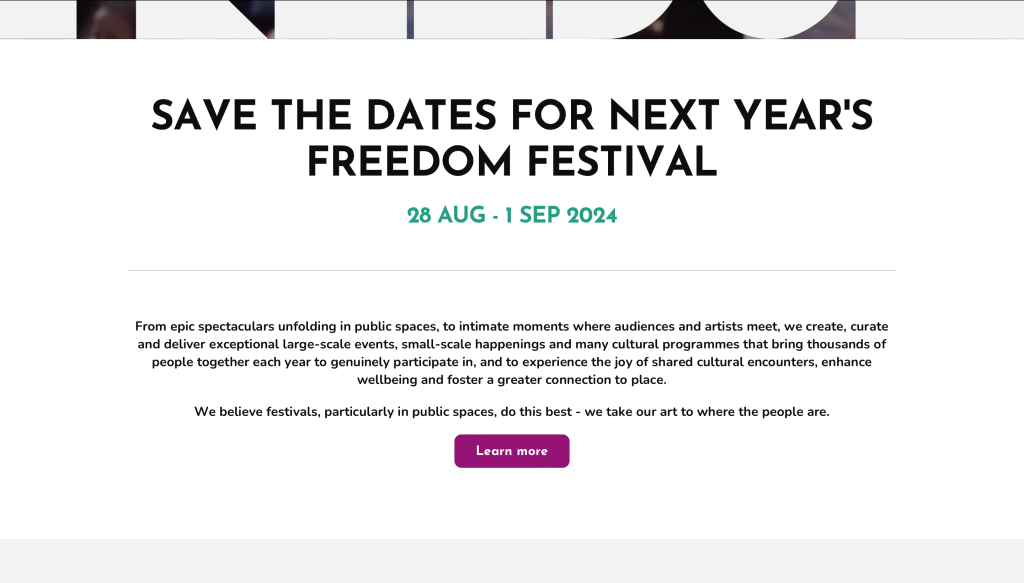 The current website for the Freedom Festival is created in a way that feels more modern and welcoming. To begin with, the site uses two sets of san serif fonts that is clear and easy to read as a contrast has been used to do so. A hierarchy is been used to direct the user of what to read first and so on, as can be seen with the larger and bolder fonts used in places, and then the change in colour in text for other important pieces of information making the site easy to navigate. Behind the logo “FREEDOM” on the main page a video is added which showcases some of the events and atmosphere of previous festivals which gives the user a idea of what the festival looks like in real time.