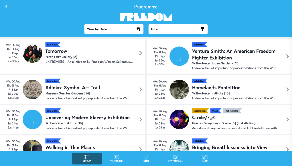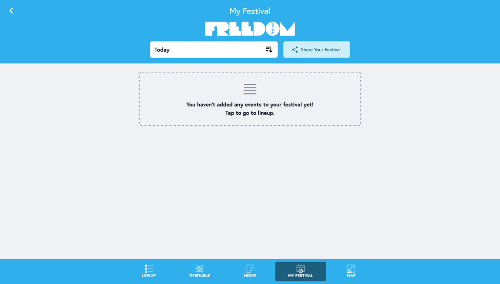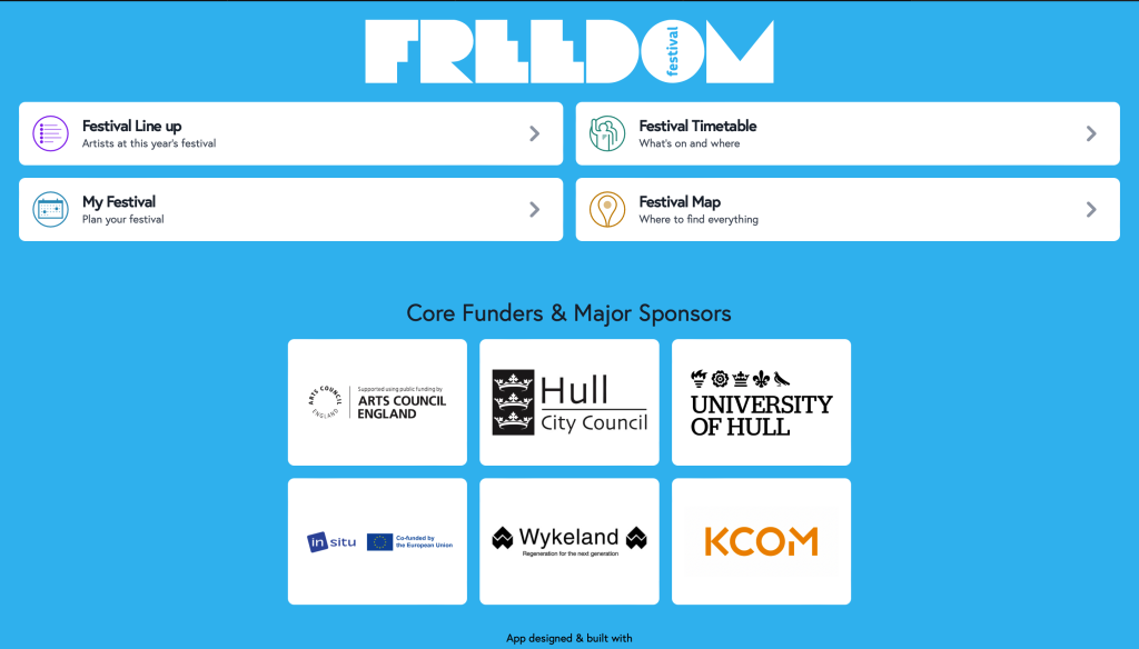This is an older app/ web page I found that was used to for the Festival in 2021. This webpage is a lot more basic in comparison to the current page, and you could say is a lot more boring and lacking on the creative side with it having just a basic blue background with the white tiles as buttons. However, the white tiles do create a contrast against the black san serif text keeping it easy to read. This webpage contains the time and dates of events and the location they are been held an allows you to create your own timetable so that you can plan out your time whilst at the festival, which is something quite unique and don’t see often on other festival based web sites which is something that may please a user using this page.
