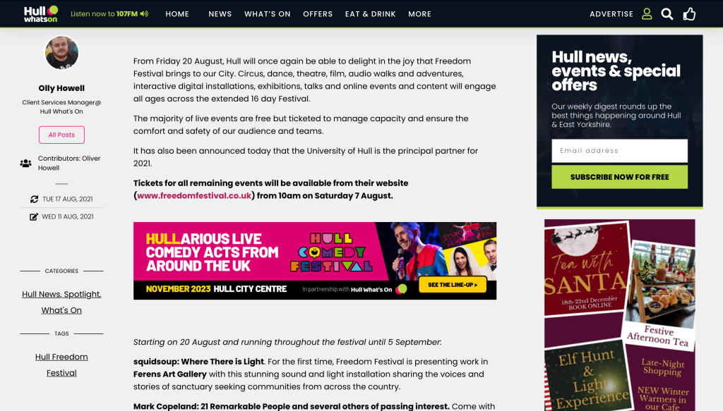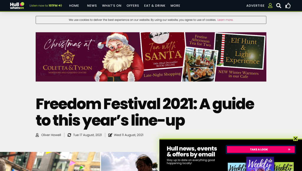 This is a webpage that I found when searching for previous Freedom Festival sites and was published in 2021. This page also looks more modern due to the use of san serif fonts. A hierarchy has again been used ro direct the user and tell them what the aim of the page is as can be seen with the enlarged and bold text. The site is clear and easy to read due to the contrast again of the black on white, and the site also follows a nice decorative colour scheme throughout of black and green which the green is taken from their logo. The overall goal of the website is to inform users of what is on during the festival and does a good job at doing that and more as at the top there are categories that are clear and easy to use telling the user about the news of the festival, special offers and extra pieces of information like where they can eat, which creates a quite positive experience.