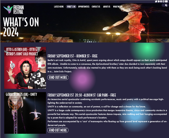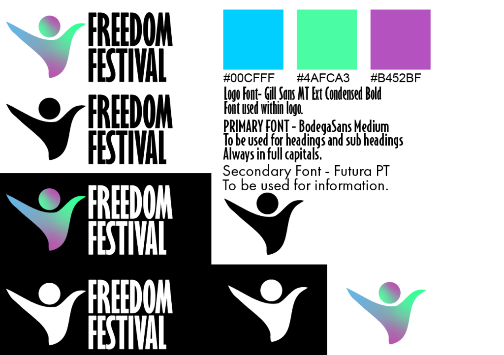 To begin with, I redesigned the logo of the festival and wanted to include something so that it wasn’t just text like the old logo, so my idea was to create a a shape that looks like a person that is waving their arms in the air to further show the message of “freedom” as typically when some expresses them self as free that’s something they would do. I also created this so that the logo could either be used with the text or used without with just the person, I did this so that the person could be used in things such as profile pictures on social media pages for the festival, and just to create an icon that people could recognise and familiarise the festival with without having the read the name. This logo I also feel is better to be used across a multichannel use do to it been more square and not just one long stretched line of text like the old logo, and so could be used on things such as merchandise on something like a shirt the logo could be placed on the top left or right, or another example could be a mug. The logo I also designed in mind that still looked effective in just a basic black or white colour which I made incase the colour within the logo clashes with the background which can be seen on some cases of the website where I have just placed a white or black version instead.