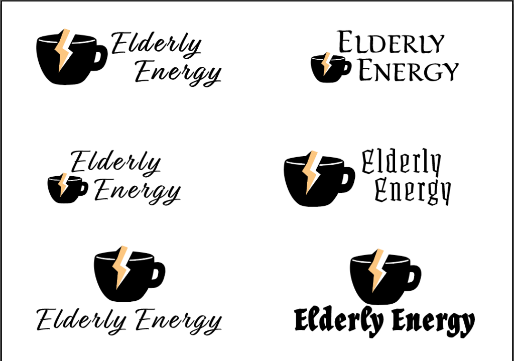 Once I had an idea of what I wanted my logo to look like I took my sketch and made a few logos on Illustrator and played with a few fonts as I wasn’t sure what look I wanted to go for. My original idea for my logo and brand was for it to be called “Elderly Energy” and I was going to go for a more old fashioned/ old schooled look and design. These first designs (above images) however I never found myself liking them no matter what font I paired the logo with and also tried to add a few more details and decoration and still didn’t like it as to me the logo looked a bit basic and flat looking. Furthermore, I had visited my grandparents one weekend and showed them the initial logo design and asked them if they would find the name “Elderly Energy” offensive which they both responded that some older people might and so I decided to go for a completely different approach with the same tea cup concept having that feedback from someone who is older helped fortify the decision to change as I didn’t want my logo/ brand to be viewed negatively by some.