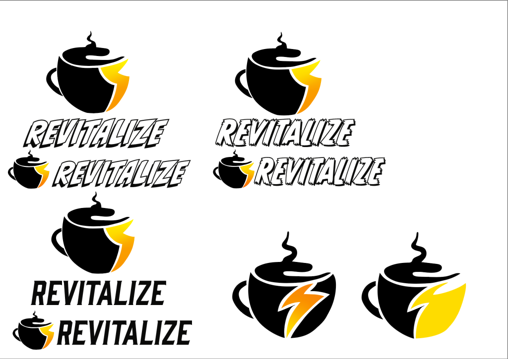 For my second attempt I decided to think of a name for the brand that was one word as it made it easier to place and fit with the logo and also a name that was more positive and eventually decided to use “Revitalize” as the description of the word is to “imbue something with new life and vitality” which is a lot more positive and it sends a message that’s what the aim of the energy drink is, and also that its what the energy drink can do for the target audience (over 60s). For the logo again I went with combining the tea mug and energy logo however this time rather than just having the energy logo go through the mug I had created it so that it became part of the mug. I again played around with a few different fonts and chose one that was more bold, clear and easy to read as it gave a lot more energy to the logo and screams the name a lot more. This logo allowed me to play around more with different colour variations too which was useful as these will be used for different flavours of my energy drink.