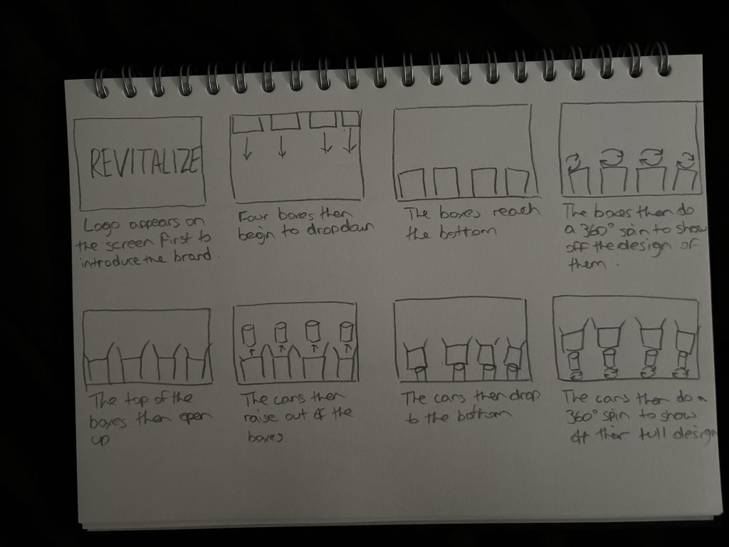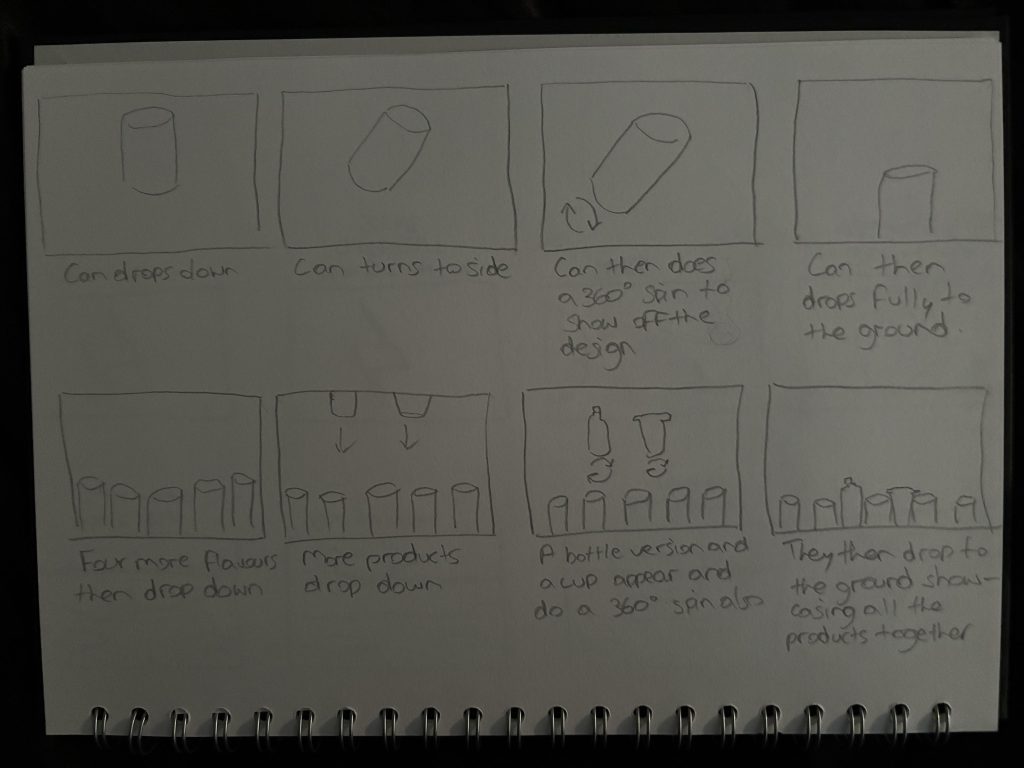 When it came to thinking about how my animation would play out I began thinking of ideas and started off by creating some rough and quick storyboards planning out how my animation would go. My first initial idea was to have an animation that had a number of products in it and show them off throughout the animation. The idea was to have a number of flavours of the canned energy drink and then I thought of including few extra products such as a bottled version of the energy drink and also a coffee cup product and then having the animation act as a showcase showing off each item. However, I decided against this idea as I felt it would be a bit of a basic animation and repetitive as it would just have the products dropping down and spinning. Once I had decided to not go with the first animation I created another quick rough storyboard and tried to think of how I could make my animation unique and tried to think of something to include within it and not create the feeling of repetition again. My idea was to have the packaging that would be used for the cans if they were sold as a multipack. Also for the second animation I decided to include the logo in the beginning of the animation to introduce the viewer to the brand so that the animation doesn’t seem as though it just randomly starts.