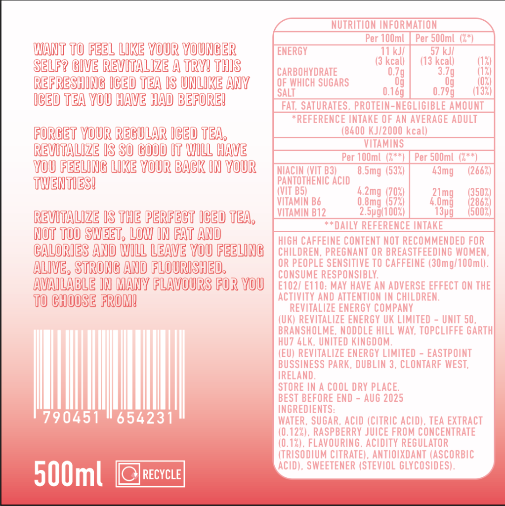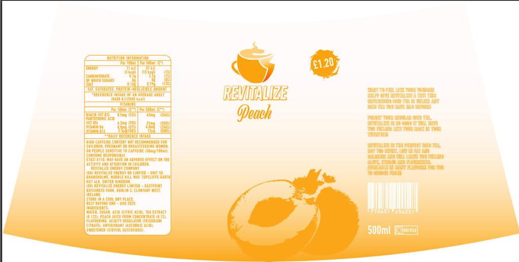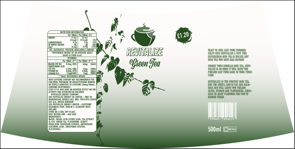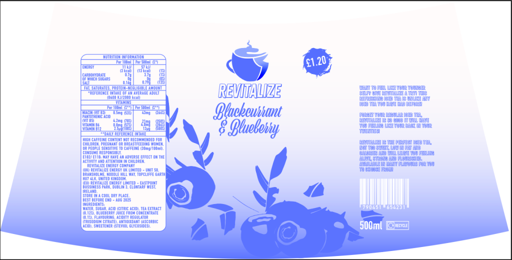 Once I had the basic layout for how I wanted each of the packaging for the flavours to look I began designing the the design for the whole of the can and adding in the mandatory information on the can and packaging such as the list of ingredients, net quantity information, any necessary warnings and so on. I then created my own barcode and placed it on the final design to make to product look more authentic and other little details such as the recycle logo and the size of the drink. I also warped the background so that it fit around the can properly when importing the graphic into substance stager. I also wrote a little message on the side of the can as it is something that you can find on a lot of energy drinks or just any sort of canned drink in general and so decided to include one within my design to again make my design look as close to a real product as possible. The message I added was also added to tell the target audience (over 60s) of how the energy drink will leave them feeling when they drink the energy drink.