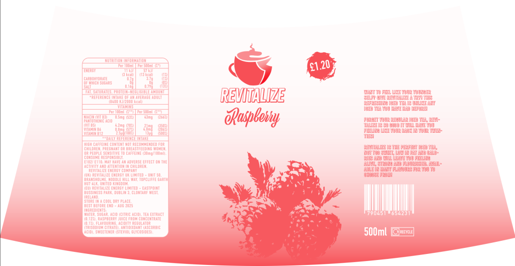 When it came to designing and creating the packaging design for my energy drink I began by creating a quick and simple thumbnail image for the can to allow me to create quick designs so that I can experiment with how I want the final outcome to look. My idea was to create a few designs as I wanted to have multiple flavours for my energy drink and wanted each flavour to have its own separate design so that they can be easily separated and recognised from one another. I researched popular tea flavours and chose four popular flavours that are typically liked by older people and chose them as the flavours for my energy drink, the flavours I chose are: raspberry, peach, blackcurrant & blueberry and green tea. Then for each flavour I coloured each design similar to the flavour and vectorised some images of each flavour and included them within the design so that each can again is easy to recognise and separate from each other. I decided to have the design and flavours based on different flavours of tea as it is something that is heavily liked by the over 60s and so if they were to see the can and packaging design it may increase the likely hood of them buying as it’s something they would like. For the font of the flavour used on the packaging I decided to use a different font to make the logo and the name of the flavour be easily separated from one another keeping it easy and clear to read and used the italic font to make the can look more fancy.