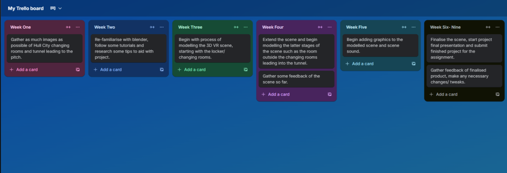 Using Trello Boards allowed me to give myself a clear and organised idea of how I aim to arrange and design my project in stages week by week. The gap between this assignment due date and the final production piece due date is 9 weeks so I have split it into an initial six weeks which gives me three weeks spare which can be used as extra time for any of the stages if need be.