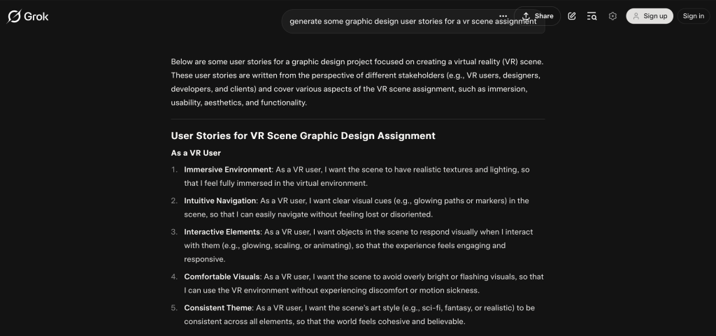 - User health: another thing to be considered is how the user will cope physically within the scene as a scene that is too long can potentially cause eye strain or aches from the headset or controllers, my aim for my scene is for it to be just over a minute long which should lower the risk of this. Another important thing to consider is claustrophobia, a scene that is too packed, small or tight could cause unnecessary stress to the user or in even more extreme cases panic attacks, to avoid this I will make sure my scene is well spaced out and make sure there is a lot of room for the user to move/ explore.