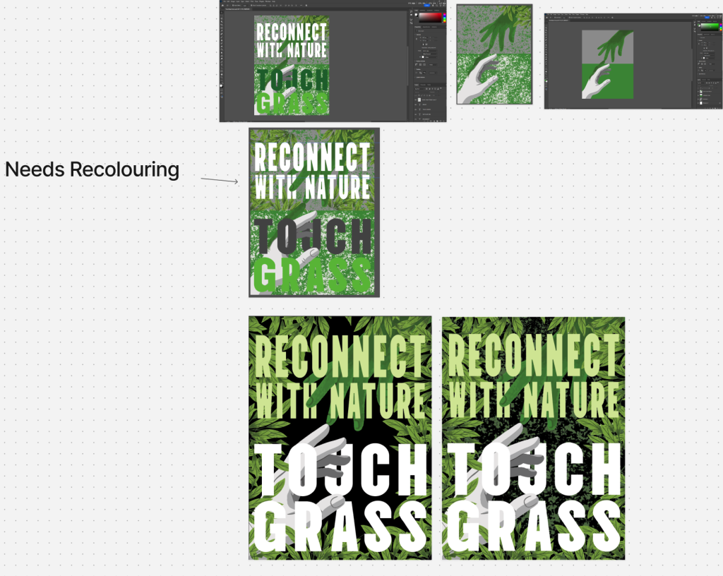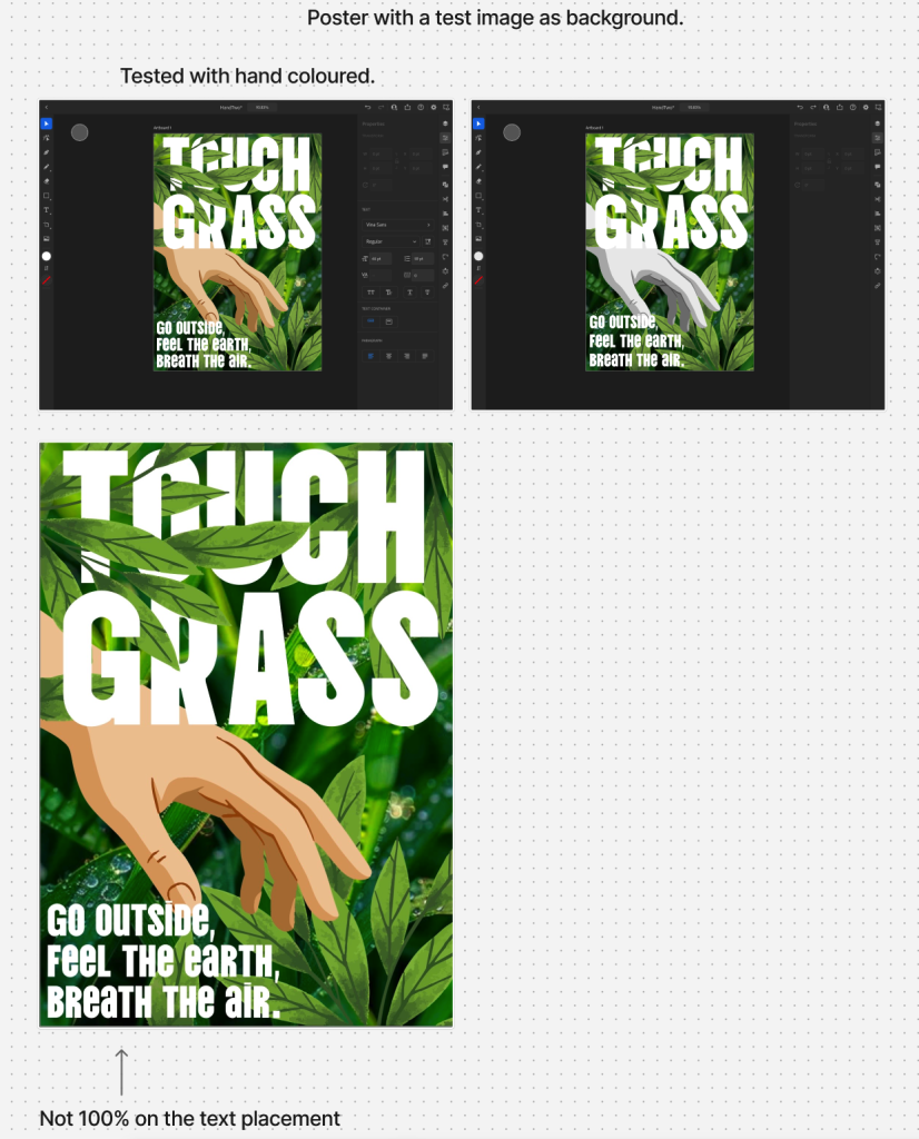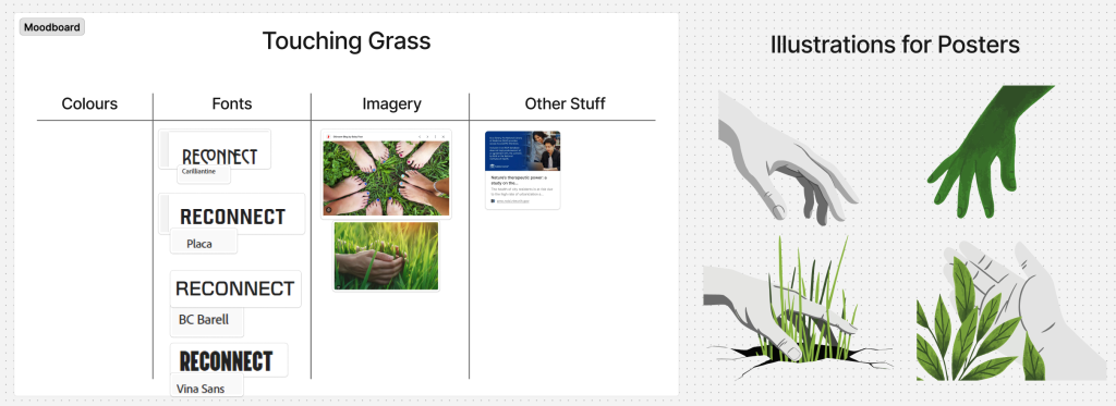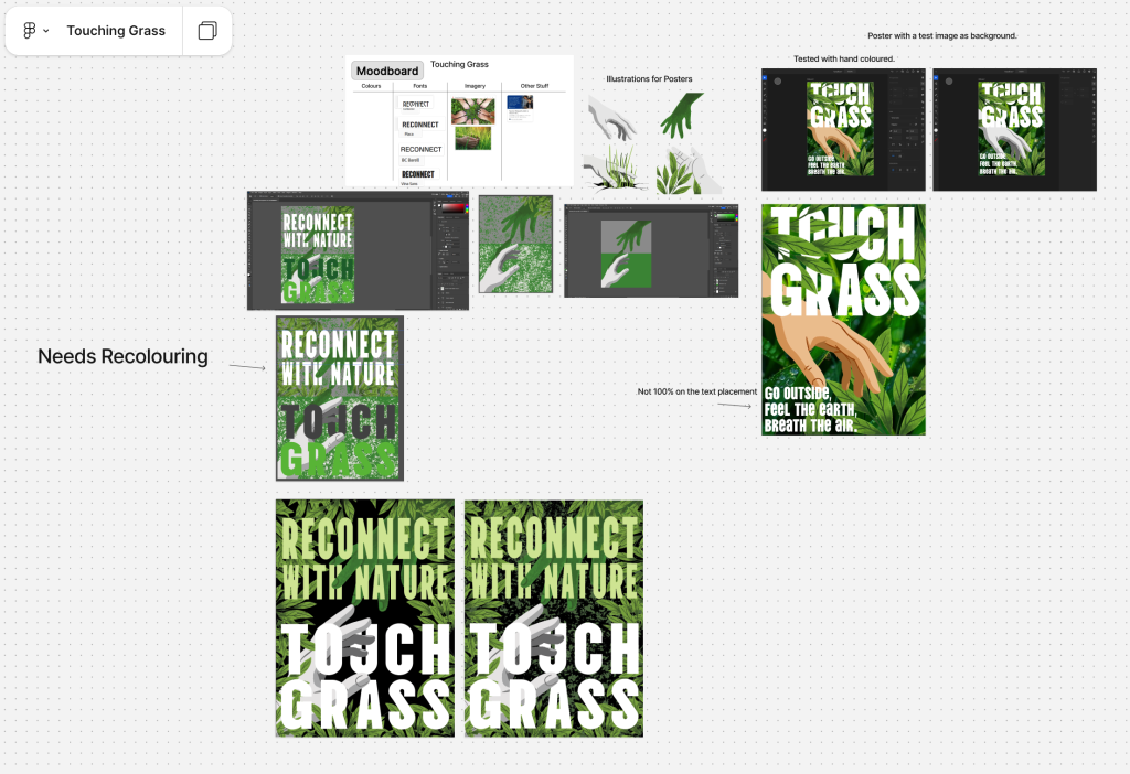 For this collaborative workshop our idea was to turn the phrase “touch grass” into a positive campaign encouraging people to get outdoor more. The phrase is usually something that is used negatively and more of an insult as it is typically something a person says to another person if they play a game too much.